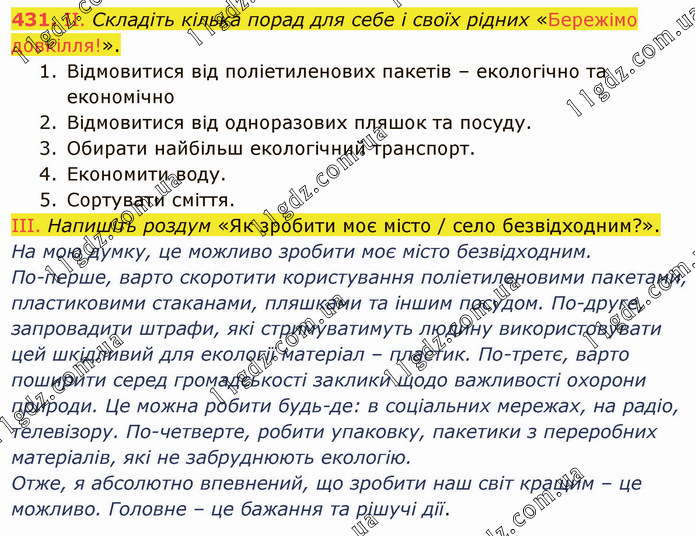 ІІ. Складіть кілька порад для себе і своїх рідних «Бережімо довкілля!». 1. Відмовитися від поліетиленових пакетів – екологічно та економічно 2. Відмовитися від одноразових пляшок та посуду. 3. Обирати найбільш екологічний транспорт. 4. Економити воду. 5. Сортувати сміття. ІІІ. Напишіть роздум «Як зробити моє місто / село безвідходним?». На мою думку, це можливо зробити моє місто безвідходним. По-перше, варто скоротити користування поліетиленовими пакетами, пластиковими стаканами, пляшками та іншим посудом. По-друге, запровадити штрафи, які стримуватимуть людину використовувати цей шкідливий для екології матеріал – пластик. По-третє, варто поширити серед громадськості заклики щодо важливості охорони природи. Це можна робити будь-де: в соціальних мережах, на радіо, телевізору. По-четверте, робити упаковку, пакетики з переробних матеріалів, які не забруднюють екологію. Отже, я абсолютно впевнений, що зробити наш світ кращим – це можливо. Головне – це бажання та рішучі дії.