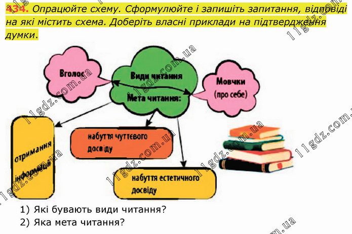 Опрацюйте схему. Сформулюйте і запишіть запитання, відповіді на які містить схема. Доберіть власні приклади на підтвердження думки. 1) Які бувають види читання? 2) Яка мета читання?