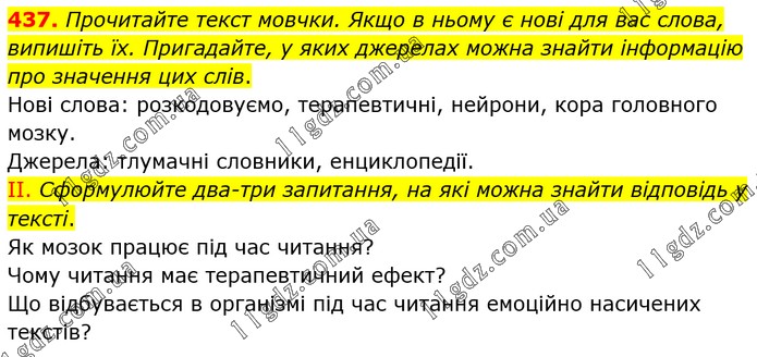 Прочитайте текст мовчки. Якщо в ньому є нові для вас слова, випишіть їх. Пригадайте, у яких джерелах можна знайти інформацію про значення цих слів. Нові слова: розкодовуємо, терапевтичні, нейрони, кора головного мозку. Джерела: тлумачні словники, енциклопедії. ІІ. Сформулюйте два-три запитання, на які можна знайти відповідь у тексті. Як мозок працює під час читання? Чому читання має терапевтичний ефект? Що відбувається в організмі під час читання емоційно насичених текстів?