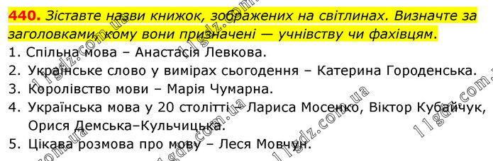 Зіставте назви книжок, зображених на світлинах. Визначте за заголовками, кому вони призначені — учнівству чи фахівцям. 1. Спільна мова – Анастасія Левкова. 2. Українське слово у вимірах сьогодення – Катерина Городенська. 3. Королівство мови – Марія Чумарна. 4. Українська мова у 20 столітті – Лариса Мосенко, Віктор Кубайчук, Орися Демська–Кульчицька. 5. Цікава розмова про мову – Леся Мовчун.