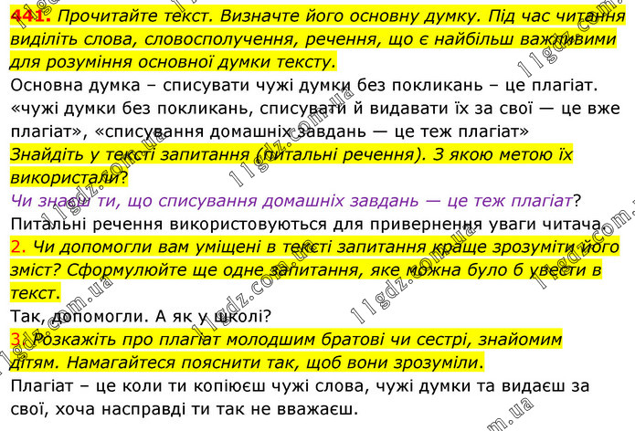 Прочитайте текст. Визначте його основну думку. Під час читання виділіть слова, словосполучення, речення, що є найбільш важливими для розуміння основної думки тексту. Основна думка – списувати чужі думки без покликань – це плагіат. «чужі думки без покликань, списувати й видавати їх за свої — це вже плагіат», «списування домашніх завдань — це теж плагіат» Знайдіть у тексті запитання (питальні речення). З якою метою їх використали? Чи знаєш ти, що списування домашніх завдань — це теж плагіат? Питальні речення використовуються для привернення уваги читача. 2. Чи допомогли вам уміщені в тексті запитання краще зрозуміти його зміст? Сформулюйте ще одне запитання, яке можна було б увести в текст. Так, допомогли. А як у школі? 3. Розкажіть про плагіат молодшим братові чи сестрі, знайомим дітям. Намагайтеся пояснити так, щоб вони зрозуміли. Плагіат – це коли ти копіюєш чужі слова, чужі думки та видаєш за свої, хоча насправді ти так не вважаєш.