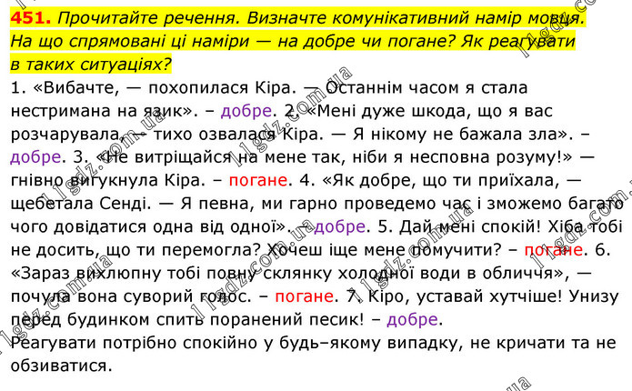 Прочитайте речення. Визначте комунікативний намір мовця. На що спрямовані ці наміри — на добре чи погане? Як реагувати в таких ситуаціях? 1. «Вибачте, — похопилася Кіра. — Останнім часом я стала нестримана на язик». – добре. 2. «Мені дуже шкода, що я вас розчарувала, — тихо озвалася Кіра. — Я нікому не бажала зла». – добре. 3. «Не витріщайся на мене так, ніби я несповна розуму!» — гнівно вигукнула Кіра. – погане. 4. «Як добре, що ти приїхала, — щебетала Сенді. — Я певна, ми гарно проведемо час і зможемо багато чого довідатися одна від одної». – добре. 5. Дай мені спокій! Хіба тобі не досить, що ти перемогла? Хочеш іще мене помучити? – погане. 6. «Зараз вихлюпну тобі повну склянку холодної води в обличчя», — почула вона суворий голос. – погане. 7. Кіро, уставай хутчіше! Унизу перед будинком спить поранений песик! – добре. Реагувати потрібно спокійно у будь–якому випадку, не кричати та не обзиватися.
