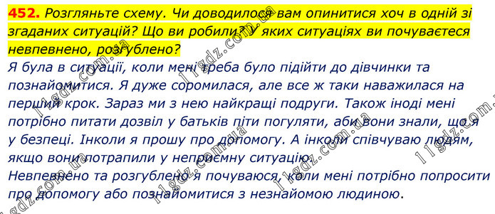 Розгляньте схему. Чи доводилося вам опинитися хоч в одній зі згаданих ситуацій? Що ви робили? У яких ситуаціях ви почуваєтеся невпевнено, розгублено? Я була в ситуації, коли мені треба було підійти до дівчинки та познайомитися. Я дуже соромилася, але все ж таки наважилася на перший крок. Зараз ми з нею найкращі подруги. Також іноді мені потрібно питати дозвіл у батьків піти погуляти, аби вони знали, що я у безпеці. Інколи я прошу про допомогу. А інколи співчуваю людям, якщо вони потрапили у неприємну ситуацію. Невпевнено та розгублено я почуваюся, коли мені потрібно попросити про допомогу або познайомитися з незнайомою людиною.