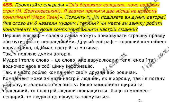 Прочитайте епіграфи «Слів бережися солодких, ноче ворожих стріл (М. Довгалевський). Я здатен прожити два місяці на доброму компліменті (Марк Твен)». Поясніть їх. Чи поділяєте ви думки авторів? Яке слово ви б назвали мудрим і теплим? Чи маєте ви звичку робити комплімент? Чи може комплімент змінити настрій людини? Перший епіграф – солодкі слова можуть приховувати страшну правду або бути просто неправдивими. Другий епіграф – хороший комплімент дарує крила, підіймає настрій та мотивує. Так, я поділяю думки авторів. Мудре і тепле слово – це слово, яке дарує людині теплі емоції та водночас несе в собі цінну інформацію. Так, я часто роблю комплімент своїм друзям або родичам. Комплімент може змінити настрій людини, як в хорошу, так і в погану сторону, в залежності від змісту. Якщо комплімент щирий та правдивий, то і настрій людини покращиться. Якщо комплімент нещирий, то людина це відчує та засмутиться.