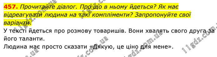 Прочитайте діалог. Про що в ньому йдеться? Як має відреагувати людина на такі компліменти? Запропонуйте свої варіанти. У тексті йдеться про розмову товаришів. Вони хвалять свого друга за його таланти. Людина має просто сказати «Дякую, це ціно для мене».