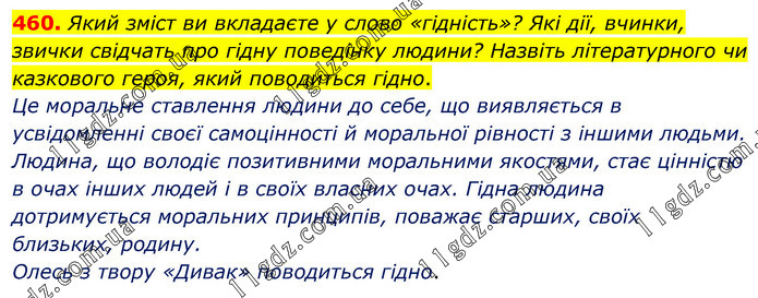 Який зміст ви вкладаєте у слово «гідність»? Які дії, вчинки, звички свідчать про гідну поведінку людини? Назвіть літературного чи казкового героя, який поводиться гідно. Це моральне ставлення людини до себе, що виявляється в усвідомленні своєї самоцінності й моральної рівності з іншими людьми. Людина, що володіє позитивними моральними якостями, стає цінністю в очах інших людей і в своїх власних очах. Гідна людина дотримується моральних принципів, поважає старших, своїх близьких, родину. Олесь з твору «Дивак» поводиться гідно.