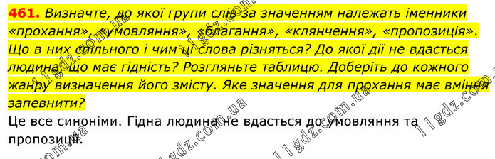 Визначте, до якої групи слів за значенням належать іменники «прохання», «умовляння», «благання», «клянчення», «пропозиція». Що в них спільного і чим ці слова різняться? До якої дії не вдасться людина, що має гідність? Розгляньте таблицю. Доберіть до кожного жанру визначення його змісту. Яке значення для прохання має вміння запевнити? Це все синоніми. Гідна людина не вдасться до умовляння та пропозиції.
