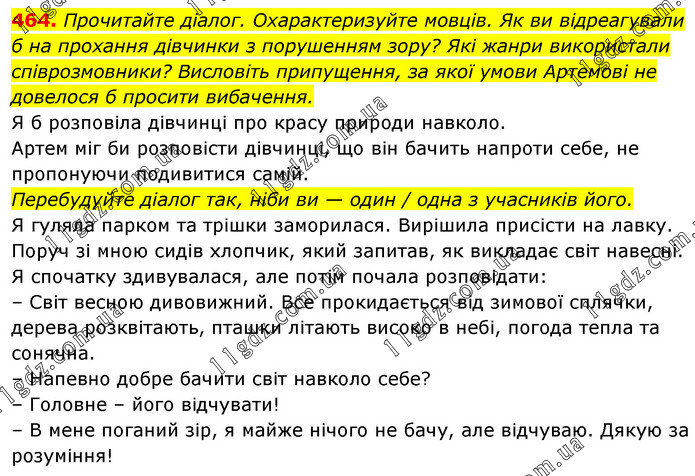 Прочитайте діалог. Охарактеризуйте мовців. Як ви відреагували б на прохання дівчинки з порушенням зору? Які жанри використали співрозмовники? Висловіть припущення, за якої умови Артемові не довелося б просити вибачення. Я б розповіла дівчинці про красу природи навколо. Артем міг би розповісти дівчинці, що він бачить напроти себе, не пропонуючи подивитися самій. Перебудуйте діалог так, ніби ви — один / одна з учасників його. Я гуляла парком та трішки заморилася. Вирішила присісти на лавку. Поруч зі мною сидів хлопчик, який запитав, як викладає світ навесні. Я спочатку здивувалася, але потім почала розповідати: – Світ весною дивовижний. Все прокидається від зимової сплячки, дерева розквітають, пташки літають високо в небі, погода тепла та сонячна. – Напевно добре бачити світ навколо себе? – Головне – його відчувати! – В мене поганий зір, я майже нічого не бачу, але відчуваю. Дякую за розуміння!