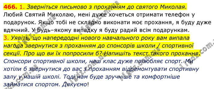 1. Зверніться письмово з проханням до святого Миколая. Любий Святий Миколаю, мені дуже хочеться отримати телефон у подарунок. Якщо тобі не складно виконати моє прохання, я буду дуже вдячний. У будь–якому випадку я буду радий всім подарункам. 3. Уявіть, що напередодні нового навчального року вам випала нагода звернутися з проханням до спонсорів школи / спортивної секції. Про що ви їх попросили б? Напишіть текст такого прохання. Спонсори спортивної школи, наш клас дуже полюбляє спорт. Ми хотіли б звернутися до вас з проханням відремонтувати спортивну залу у нашій школі. Тоді нам буде зручніше та комфортніше займатися спортом. Дякуємо!