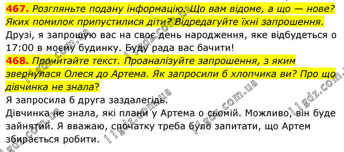 467. Розгляньте подану інформацію. Що вам відоме, а що — нове? Яких помилок припустилися діти? Відредагуйте їхні запрошення. Друзі, я запрошую вас на своє день народження, яке відбудеться о 17:00 в моєму будинку. Буду рада вас бачити! 468. Прочитайте текст. Проаналізуйте запрошення, з яким звернулася Олеся до Артема. Як запросили б хлопчика ви? Про що дівчинка не знала? Я запросила б друга заздалегідь. Дівчинка не знала, які плани у Артема о сьомій. Можливо, він буде зайнятий. Я вважаю, спочатку треба було запитати, що Артем збирається робити.