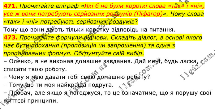 471. Прочитайте епіграф «Які б не були короткі слова «так» і «ні», усе ж вони потребують серйозних роздумів (Піфагор)». Чому слова «так» і «ні» потребують серйозних роздумів? Тому що вони дають тільки коротку відповідь на питання. 473. Прочитайте формули відмови. Складіть діалог, в основі якого має бути прохання (пропозиція чи запрошення) та одна з пропонованих формул. Обґрунтуйте свій вибір. – Оленко, я не виконав домашнє завдання. Дай мені, будь ласка, списати твою роботу. – Чому я маю давати тобі свою домашню роботу? – Тому що ти моя найкраща подруга. – Пробач, але якщо я погоджуся, то це означатиме, що я порушу свої життєві принципи.