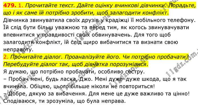 1. Прочитайте текст. Дайте оцінку вчинкові дівчинки. Порадьте, що і як саме їй потрібно зробити, щоб залагодити конфлікт. Дівчинка звинуватила своїх друзів у крадіжці її мобільного телефону. Їй слід бути більш уважною та перед тим, як когось звинувачувати впевнитися у правдивості своїх обвинувачень. Для того щоб залагодити конфлікт, їй слід щиро вибачитися та визнати свою неправоту. 2. Прочитайте діалог. Проаналізуйте його. Чи потрібно пробачати? Перебудуйте діалог так, щоб дівчатка порозумілися. Я думаю, що потрібно пробачати, особливо сестру. – Пробач мені, будь ласка, Джо. Мені дуже–дуже шкода, що я так вчинила. Обіцяю, цього більше ніколи не повториться! – Добре, дякую за вибачення. Для мене це дуже важливо та цінно! Сподіваюся, ти зрозуміла, що була неправа.