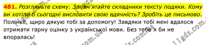 Розгляньте схему. Запам'ятайте складники тексту подяки. Кому ви хотіли б сьогодні висловити свою вдячність? Зробіть це письмово. Полінко, щиро дякую тобі за допомогу! Завдяки тобі мені вдалося отримати гарну оцінку з української мови. Без тебе я би не впоралась!