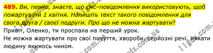 Ви, певно, знаєте, що смс–повідомлення використовують, щоб пожартувати 1 квітня. Напишіть текст такого повідомлення для свого друга / своєї подруги. Про що не можна жартувати? Привіт, Оленко, ти проспала на перший урок. Не можна жартувати про свої почуття, хвороби, серйозні речі, лякати людину якимось чином.