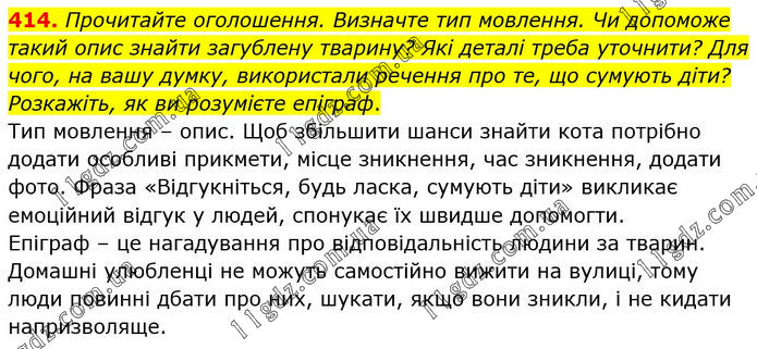 Прочитайте оголошення. Визначте тип мовлення. Чи допоможе такий опис знайти загублену тварину? Які деталі треба уточнити? Для чого, на вашу думку, використали речення про те, що сумують діти? Розкажіть, як ви розумієте епіграф. Тип мовлення – опис. Щоб збільшити шанси знайти кота потрібно додати особливі прикмети, місце зникнення, час зникнення, додати фото. Фраза «Відгукніться, будь ласка, сумують діти» викликає емоційний відгук у людей, спонукає їх швидше допомогти. Епіграф – це нагадування про відповідальність людини за тварин. Домашні улюбленці не можуть самостійно вижити на вулиці, тому люди повинні дбати про них, шукати, якщо вони зникли, і не кидати напризволяще.