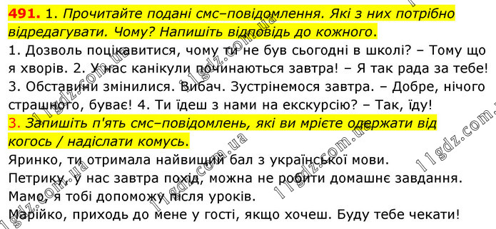 1. Прочитайте подані смс–повідомлення. Які з них потрібно відредагувати. Чому? Напишіть відповідь до кожного. 1. Дозволь поцікавитися, чому ти не був сьогодні в школі? – Тому що я хворів. 2. У нас канікули починаються завтра! – Я так рада за тебе! 3. Обставини змінилися. Вибач. Зустрінемося завтра. – Добре, нічого страшного, буває! 4. Ти їдеш з нами на екскурсію? – Так, їду! 3. Запишіть п'ять смс–повідомлень, які ви мрієте одержати від когось / надіслати комусь. Яринко, ти отримала найвищий бал з української мови. Петрику, у нас завтра похід, можна не робити домашнє завдання. Мамо, я тобі допоможу після уроків. Марійко, приходь до мене у гості, якщо хочеш. Буду тебе чекати!