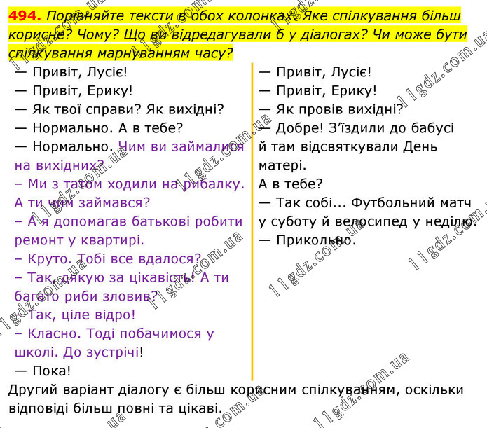 Порівняйте тексти в обох колонках. Яке спілкування більш корисне? Чому? Що ви відредагували б у діалогах? Чи може бути спілкування марнуванням часу? — Привіт, Лусіє! — Привіт, Ерику! — Як твої справи? Як вихідні? — Нормально. А в тебе? — Нормально. Чим ви займалися на вихідних? – Ми з татом ходили на рибалку. А ти чим займався? – А я допомагав батькові робити ремонт у квартирі. – Круто. Тобі все вдалося? – Так, дякую за цікавість! А ти багато риби зловив? – Так, ціле відро! – Класно. Тоді побачимося у школі. До зустрічі! — Пока! — Привіт, Лусіє! — Привіт, Ерику! — Як провів вихідні? — Добре! З’їздили до бабусі й там відсвяткували День матері. А в тебе? — Так собі... Футбольний матч у суботу й велосипед у неділю. — Прикольно. Другий варіант діалогу є більш корисним спілкуванням, оскільки відповіді більш повні та цікаві.