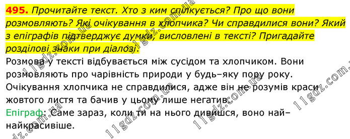 Прочитайте текст. Хто з ким спілкується? Про що вони розмовляють? Які очікування в хлопчика? Чи справдилися вони? Який з епіграфів підтверджує думки, висловлені в тексті? Пригадайте розділові знаки при діалозі. Розмова у тексті відбувається між сусідом та хлопчиком. Вони розмовляють про чарівність природи у будь–яку пору року. Очікування хлопчика не справдилися, адже він не розумів краси жовтого листя та бачив у цьому лише негатив. Епіграф: Саме зараз, коли ти на нього дивишся, воно най–найкрасивіше.