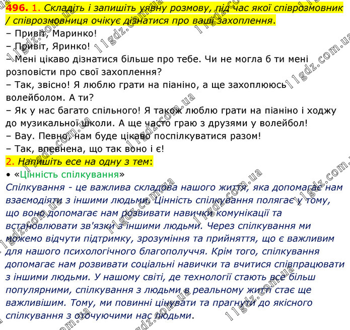 1. Складіть і запишіть уявну розмову, під час якої співрозмовник / співрозмовниця очікує дізнатися про ваші захоплення. – Привіт, Маринко! – Привіт, Яринко! – Мені цікаво дізнатися більше про тебе. Чи не могла б ти мені розповісти про свої захоплення? – Так, звісно! Я люблю грати на піаніно, а ще захоплююсь волейболом. А ти? – Як у нас багато спільного! Я також люблю грати на піаніно і ходжу до музикальної школи. А ще часто граю з друзями у волейбол! – Вау. Певно, нам буде цікаво поспілкуватися разом! – Так, впевнена, що так воно і є! 2. Напишіть есе на одну з тем: • «Цінність спілкування» Спілкування - це важлива складова нашого життя, яка допомагає нам взаємодіяти з іншими людьми. Цінність спілкування полягає у тому, що воно допомагає нам розвивати навички комунікації та встановлювати зв'язки з іншими людьми. Через спілкування ми можемо відчути підтримку, зрозуміння та прийняття, що є важливим для нашого психологічного благополуччя. Крім того, спілкування допомагає нам розвивати соціальні навички та вчитися співпрацювати з іншими людьми. У нашому світі, де технології стають все більш популярними, спілкування з людьми в реальному житті стає ще важливішим. Тому, ми повинні цінувати та прагнути до якісного спілкування з оточуючими нас людьми.