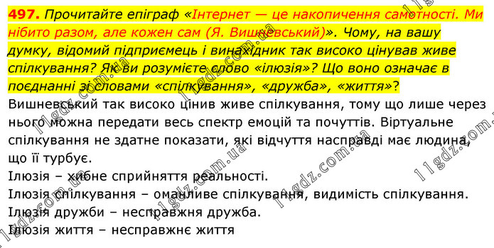 Прочитайте епіграф «Інтернет — це накопичення самотності. Ми нібито разом, але кожен сам (Я. Вишневський)». Чому, на вашу думку, відомий підприємець і винахідник так високо цінував живе спілкування? Як ви розумієте слово «ілюзія»? Що воно означає в поєднанні зі словами «спілкування», «дружба», «життя»? Вишневський так високо цінив живе спілкування, тому що лише через нього можна передати весь спектр емоцій та почуттів. Віртуальне спілкування не здатне показати, які відчуття насправді має людина, що її турбує. Ілюзія – хибне сприйняття реальності. Ілюзія спілкування – оманливе спілкування, видимість спілкування. Ілюзія дружби – несправжня дружба. Ілюзія життя – несправжнє життя