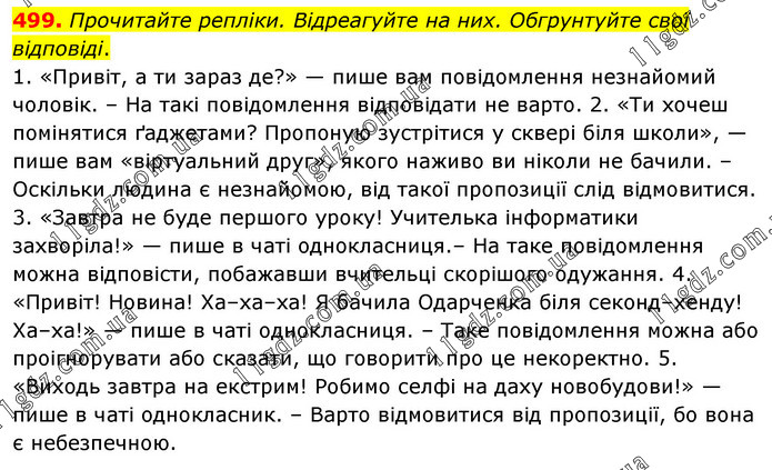Прочитайте репліки. Відреагуйте на них. Обгрунтуйте свої відповіді. 1. «Привіт, а ти зараз де?» — пише вам повідомлення незнайомий чоловік. – На такі повідомлення відповідати не варто. 2. «Ти хочеш помінятися ґаджетами? Пропоную зустрітися у сквері біля школи», — пише вам «віртуальний друг», якого наживо ви ніколи не бачили. – Оскільки людина є незнайомою, від такої пропозиції слід відмовитися. 3. «Завтра не буде першого уроку! Учителька інформатики захворіла!» — пише в чаті однокласниця.– На таке повідомлення можна відповісти, побажавши вчительці скорішого одужання. 4. «Привіт! Новина! Ха–ха–ха! Я бачила Одарченка біля секонд–хенду! Ха–ха!» — пише в чаті однокласниця. – Таке повідомлення можна або проігнорувати або сказати, що говорити про це некоректно. 5. «Виходь завтра на екстрим! Робимо селфі на даху новобудови!» — пише в чаті однокласник. – Варто відмовитися від пропозиції, бо вона є небезпечною.