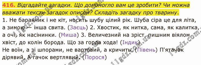 Відгадайте загадки. Що допомогло вам це зробити? Чи можна вважати тексти загадок описом? Складіть загадку про тварину. 1. Не баранчик і не кіт, носить шубу цілий рік. Шуба сіра це для літа, а зимою — інша свита. (Заєць) 2. Хвостик, як нитка, сама, як калитка, а очі, як насінинки. (Миша) 3. Величезний на зріст, пишним віялом хвіст, до колін борода. Що за горда хода! (Індик) Не воїн, а зі шпорами, не вартовий, а кричить. (Півень) П'ятачок дірявий, А гачок вертлявий. (Порося)