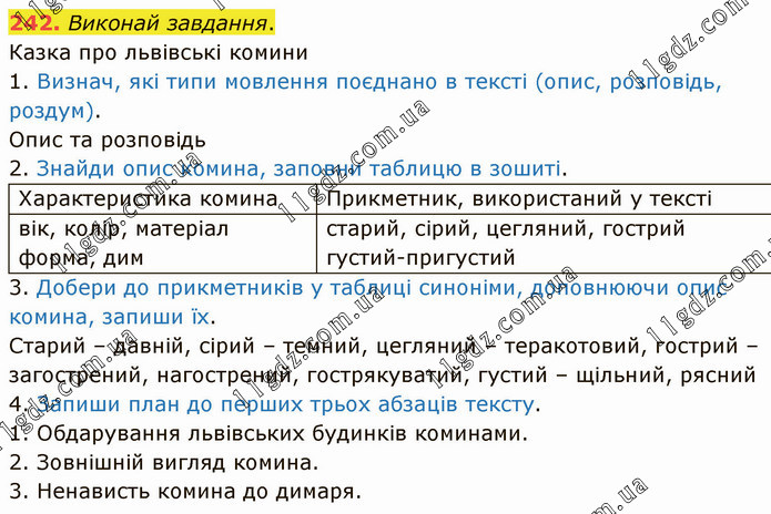 Виконай завдання. Казка про львівські комини 1. Визнач, які типи мовлення поєднано в тексті (опис, розповідь, роздум). Опис та розповідь 2. Знайди опис комина, заповни таблицю в зошиті. Характеристика комина Прикметник, використаний у тексті вік, колір, матеріал форма, дим старий, сірий, цегляний, гострий густий-пригустий 3. Добери до прикметників у таблиці синоніми, доповнюючи опис комина, запиши їх. Старий – давній, сірий – темний, цегляний – теракотовий, гострий – загострений, нагострений, гострякуватий, густий – щільний, рясний 4. Запиши план до перших трьох абзаців тексту. 1. Обдарування львівських будинків коминами. 2. Зовнішній вигляд комина. 3. Ненависть комина до димаря.