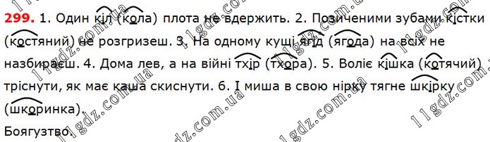 1. Один кіл (кола) плота не вдержить. 2. Позиченими зубами кістки (костяний) не розгризеш. 3. На одному кущі ягід (ягода) на всіх не назбираєш. 4. Дома лев, а на війні тхір (тхора). 5. Воліє кішка (котячий) тріснути, як має каша скиснути. 6. І миша в свою нірку тягне шкірку (шкоринка). Боягузтво.