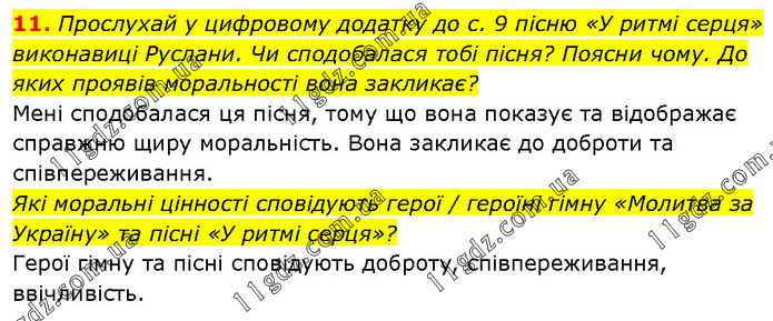 Прослухай у цифровому додатку до с. 9 пісню «У ритмі серця» виконавиці Руслани. Чи сподобалася тобі пісня? Поясни чому. До яких проявів моральності вона закликає? Мені сподобалася ця пісня, тому що вона показує та відображає справжню щиру моральність. Вона закликає до доброти та співпереживання. Які моральні цінності сповідують герої / героїні гімну «Молитва за Україну» та пісні «У ритмі серця»? Герої гімну та пісні сповідують доброту, співпереживання, ввічливість.