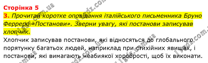 3. Прочитай коротке оповідання італійського письменника Бруно Ферреро «Постанови». Зверни увагу, які постанови записував хлопчик. Хлопчик записував постанови, які відносяться до глобального порятунку багатьох людей, наприклад при стихійних явищах, і постанови, які вимагають неабиякої хоробрості, щоб їх виконати.