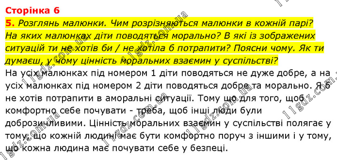 5. Розглянь малюнки. Чим розрізняються малюнки в кожній парі? На яких малюнках діти поводяться морально? В які із зображених ситуацій ти не хотів би / не хотіла б потрапити? Поясни чому. Як ти думаєш, у чому цінність моральних взаємин у суспільстві? На усіх малюнках під номером 1 діти поводяться не дуже добре, а на усіх малюнках під номером 2 діти поводяться добре та морально. Я б не хотів потрапити в аморальні ситуації. Тому що для того, щоб комфортно себе почувати - треба, щоб інші люди були доброзичливими. Цінність моральних взаємин у суспільстві полягає у тому, що кожній людині має бути комфортно поруч з іншими і у тому, що кожна людина має почувати себе у безпеці.