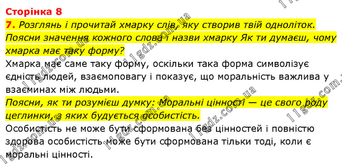 7. Розглянь і прочитай хмарку слів, яку створив твій одноліток. Поясни значення кожного слова і назви хмарку Як ти думаєш, чому хмарка має таку форму? Хмарка має саме таку форму, оскільки така форма символізує єдність людей, взаємоповагу і показує, що моральність важлива у взаєминах між людьми. Поясни, як ти розумієш думку: Моральні цінності — це свого роду цеглинки, з яких будується особистість. Особистість не може бути сформована без цінностей і повністю здорова особистість може бути сформована тільки тоді, коли є моральні цінності.