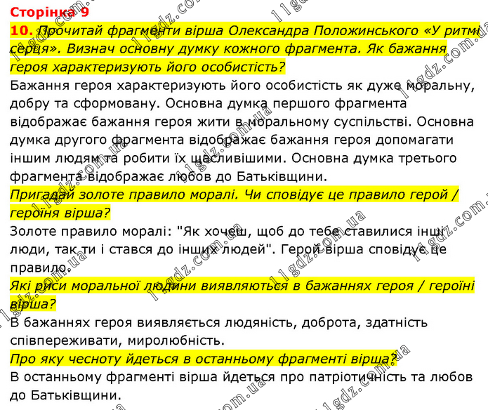 10. Прочитай фрагменти вірша Олександра Положинського «У ритмі серця». Визнач основну думку кожного фрагмента. Як бажання героя характеризують його особистість? Бажання героя характеризують його особистість як дуже моральну, добру та сформовану. Основна думка першого фрагмента відображає бажання героя жити в моральному суспільстві. Основна думка другого фрагмента відображає бажання героя допомагати іншим людям та робити їх щасливішими. Основна думка третього фрагмента відображає любов до Батьківщини. Пригадай золоте правило моралі. Чи сповідує це правило герой / героїня вірша? Золоте правило моралі: "Як хочеш, щоб до тебе ставилися інші люди, так ти і стався до інших людей". Герой вірша сповідує це правило. Які риси моральної людини виявляються в бажаннях героя / героїні вірша? В бажаннях героя виявляється людяність, доброта, здатність співпереживати, миролюбність. Про яку чесноту йдеться в останньому фрагменті вірша? В останньому фрагменті вірша йдеться про патріотичність та любов до Батьківщини.