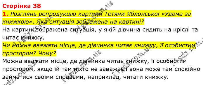 Розглянь репродукцію картини Тетяни Яблонської «Удома за книжкою». Яка ситуація зображена на картині? На картині зображена ситуація, у якій дівчина сидить на кріслі та читає книжку. Чи можна вважати місце, де дівчинка читає книжку, її особистим простором? Чому? Можна вважати місце, де дівчинка читає книжку, її особистим простором, якщо їй там ніхто не заважає і вона може там спокійно займатися своїми справами, наприклад, читати книжку.
