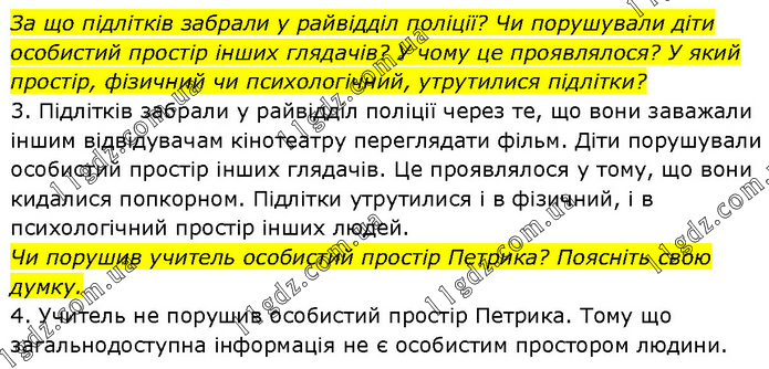 За що підлітків забрали у райвідділ поліції? Чи порушували діти особистий простір інших глядачів? У чому це проявлялося? У який простір, фізичний чи психологічний, утрутилися підлітки? 3. Підлітків забрали у райвідділ поліції через те, що вони заважали іншим відвідувачам кінотеатру переглядати фільм. Діти порушували особистий простір інших глядачів. Це проявлялося у тому, що вони кидалися попкорном. Підлітки утрутилися і в фізичний, і в психологічний простір інших людей. Чи порушив учитель особистий простір Петрика? Поясніть свою думку. 4. Учитель не порушив особистий простір Петрика. Тому що загальнодоступна інформація не є особистим простором людини.