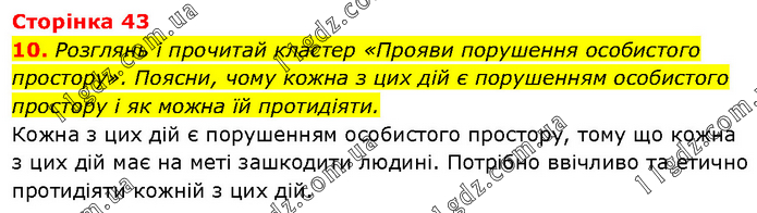 Розглянь і прочитай кластер «Прояви порушення особистого простору». Поясни, чому кожна з цих дій є порушенням особистого простору і як можна їй протидіяти. Кожна з цих дій є порушенням особистого простору, тому що кожна з цих дій має на меті зашкодити людині. Потрібно ввічливо та етично протидіяти кожній з цих дій.