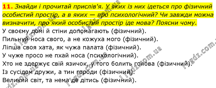 Знайди і прочитай прислів'я. У яких із них ідеться про фізичний особистий простір, а в яких — про психологічний? Чи завжди можна визначити, про який особистий простір іде мова? Поясни чому. У своєму домі й стіни допомагають (фізичний). Пильнуй носа свого, а не кожуха мого (фізичний). Ліпша своя хата, як чужа палата (фізичний). У чуже просо не пхай носа (психологічний). Хто не здержує свій язичок, у того болить голова (фізичний). Із сусідом дружи, а тин городи (фізичний). Великий світ, та нема де дітись (фізичний).