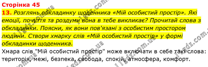 Розглянь обкладинку щоденника «Мій особистий простір». Які емоції, почуття та роздуми вона в тебе викликає? Прочитай слова з обкладинки. Поясни, як вони пов'язані з особистим простором людини. Створи хмарку слів «Мій особистий простір» у формі обкладинки щоденника. Хмара слів "Мій особистий простір" може включати в себе такі слова: територія, межі, безпека, свобода, спокій, атмосфера, комфорт.