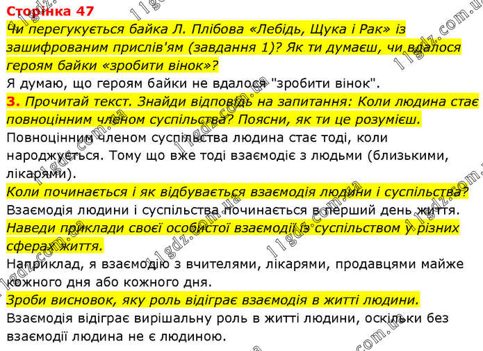 Чи перегукується байка Л. Плібова «Лебідь, Щука і Рак» із зашифрованим прислів'ям (завдання 1)? Як ти думаєш, чи вдалося героям байки «зробити вінок»? Я думаю, що героям байки не вдалося "зробити вінок". 3. Прочитай текст. Знайди відповідь на запитання: Коли людина стає повноцінним членом суспільства? Поясни, як ти це розумієш. Повноцінним членом суспільства людина стає тоді, коли народжується. Тому що вже тоді взаємодіє з людьми (близькими, лікарями). Коли починається і як відбувається взаємодія людини і суспільства? Взаємодія людини і суспільства починається в перший день життя. Наведи приклади своєї особистої взаємодії із суспільством у різних сферах життя. Наприклад, я взаємодію з вчителями, лікарями, продавцями майже кожного дня або кожного дня. Зроби висновок, яку роль відіграє взаємодія в житті людини. Взаємодія відіграє вирішальну роль в житті людини, оскільки без взаємодії людина не є людиною.