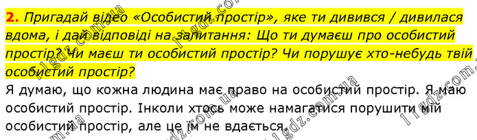 Пригадай відео «Особистий простір», яке ти дивився / дивилася вдома, і дай відповіді на запитання: Що ти думаєш про особистий простір? Чи маєш ти особистий простір? Чи порушує хто-небудь твій особистий простір? Я думаю, що кожна людина має право на особистий простір. Я маю особистий простір. Інколи хтось може намагатися порушити мій особистий простір, але це їм не вдається.