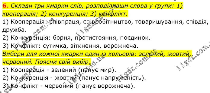 Склади три хмарки слів, розподіливши слова у групи: 1) кооперація; 2) конкуренція; 3) конфлікт. 1) Кооперація: співпраця, співробітництво, товаришування, співдія, дружба. 2) Конкуренція: борня, протистояння, поєдинок. 3) Конфлікт: сутичка, зіткнення, ворожнеча. Вибери для кожної хмарки один із кольорів: зелений, жовтий, червоний. Поясни свій вибір. 1) Кооперація - зелений (панує мир). 2) Конкуренція - жовтий (панує напруженість). 3) Конфлікт - червоний (панує ворожнеча).