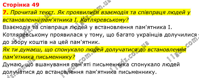 Прочитай текст. Як проявилися взаємодія та співпраця людей у встановленні пам'ятника І. Котляревському? Взаємодія та співпраця людей у встановлення пам'ятника І. Котляревському проявилася у тому, що багато українців долучилися до збору коштів на цей пам'ятник. Як ти думаєш, що спонукало людей долучатися до встановлення пам'ятника письменнику? Думаю, що вшанування пам'яті письменника спонукало людей долучатися до встановлення пам'ятника письменнику.