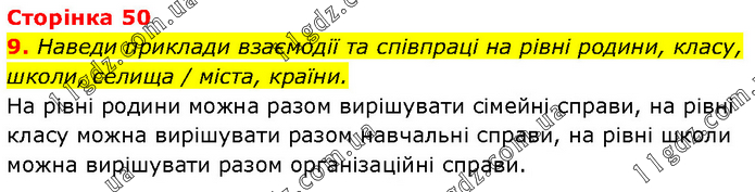 Наведи приклади взаємодії та співпраці на рівні родини, класу, школи, селища / міста, країни. На рівні родини можна разом вирішувати сімейні справи, на рівні класу можна вирішувати разом навчальні справи, на рівні школи можна вирішувати разом організаційні справи.