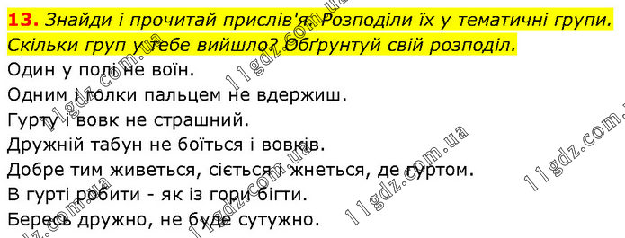 Знайди і прочитай прислів'я. Розподіли їх у тематичні групи. Скільки груп у тебе вийшло? Обґрунтуй свій розподіл. Один у полі не воїн. Одним і голки пальцем не вдержиш. Гурту і вовк не страшний. Дружній табун не боїться і вовків. Добре тим живеться, сіється і жнеться, де гуртом. В гурті робити - як із гори бігти. Бересь дружно, не буде сутужно.