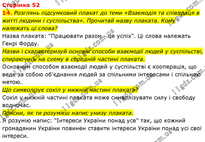 Розглянь підсумковий плакат до теми «Взаємодія та співпраця в житті людини і суспільства». Прочитай назву плаката. Кому належать ці слова? Назва плаката: "Працювати разом - це успіх". Ці слова належать Генрі Форду. Назви і схарактеризуй основні способи взаємодії людей у суспільстві, спираючись на схему в середній частині плаката. Основним способом взаємодії людей у суспільстві є кооперація, що веде за собою об'єднання людей за спільними інтересами і спільною метою. Що символізує сокіл у нижній частині плаката? Сокіл у нижній частині плаката може символізувати силу і свободу водночас. Поясни, як ти розумієш напис унизу плаката. Я розумію напис: "Інтереси України понад усе" так, що кожний громадянин України повинен ставити інтереси України понад усі свої інтереси.
