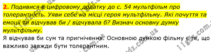 Подивися в цифровому додатку до с. 54 мультфільм про толерантність. Уяви себе на місці героя мультфільму. Які почуття та емоції ти відчував би / відчувала б? Визнач основну думку мультфільму. Я відчував би сум та пригнічення. Основною думкою фільму є те, що важливо завжди бути толерантним.