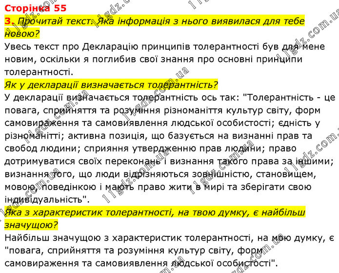 Прочитай текст. Яка інформація з нього виявилася для тебе новою? Увесь текст про Декларацію принципів толерантності був для мене новим, оскільки я поглибив свої знання про основні принципи толерантності. Як у декларації визначається толерантність? У декларації визначається толерантність ось так: "Толерантність - це повага, сприйняття та розуміння різноманіття культур світу, форм самовираження та самовиявлення людської особистості; єдність у різноманітті; активна позиція, що базується на визнанні прав та свобод людини; сприяння утвердженню прав людини; право дотримуватися своїх переконань і визнання такого права за іншими; визнання того, що люди відрізняються зовнішністю, становищем, мовою, поведінкою і мають право жити в мирі та зберігати свою індивідуальність". Яка з характеристик толерантності, на твою думку, є найбільш значущою? Найбільш значущою з характеристик толерантності, на мою думку, є "повага, сприйняття та розуміння культур світу, форм самовираження та самовиявлення людської особистості".