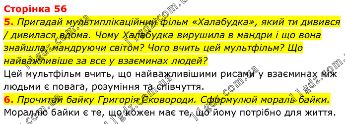 5. Пригадай мультиплікаційний фільм «Халабудка», який ти дивився / дивилася вдома. Чому Халабудка вирушила в мандри і що вона знайшла, мандруючи світом? Чого вчить цей мультфільм? Що найважливіше за все у взаєминах людей? Цей мультфільм вчить, що найважливішими рисами у взаєминах між людьми є повага, розуміння та співчуття. 6. Прочитай байку Григорія Сковороди. Сформулюй мораль байки. Мораллю байки є те, що кожен має те, що йому потрібно для життя.