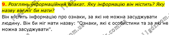 Розглянь інформаційний плакат. Яку інформацію він містить? Яку назву він міг би мати? Він містить інформацію про ознаки, за які не можна засуджувати людину. Він би міг мати назву: "Ознаки, які є особистими та за які не можна засуджувати".