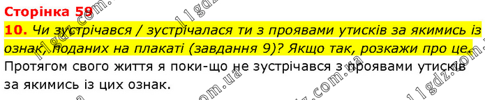 Чи зустрічався / зустрічалася ти з проявами утисків за якимись із ознак, поданих на плакаті (завдання 9)? Якщо так, розкажи про це. Протягом свого життя я поки-що не зустрічався з проявами утисків за якимись із цих ознак.